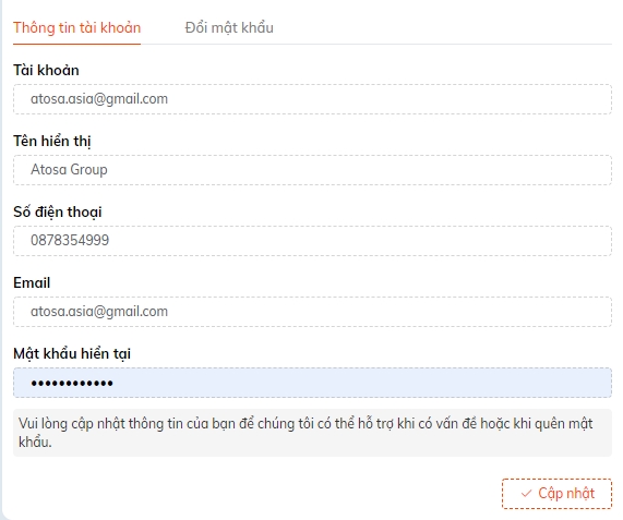 ATOSA khuyến cáo Khách hàng đổi mật khẩu hệ thống gửi qua email trong lần đầu tiên đăng nhập vào hệ thống app.atosa.asia