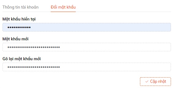 Gõ mật khẩu mới đồng thời xác nhận lại mật khẩu mới => Bấm "Cập nhật" để hoàn thành nha sốp yêu.