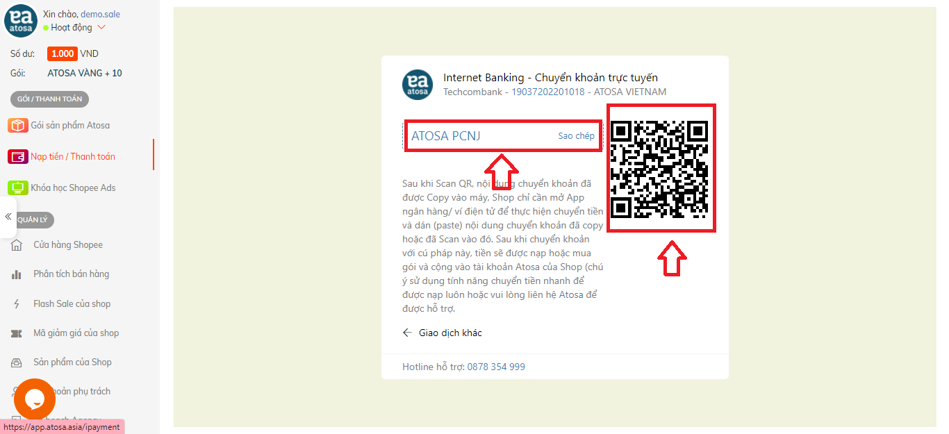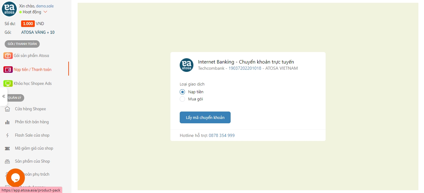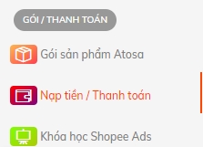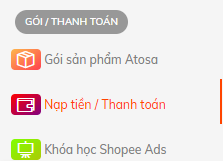 Để mua gói sản phẩm Atosa, ngoài cách đã được hướng dẫn tại đây. Shop có thể dùng đến phương thức nạp tiền vào tài khoản Atosa một cách nhanh chóng với 4 bước đơn giản: