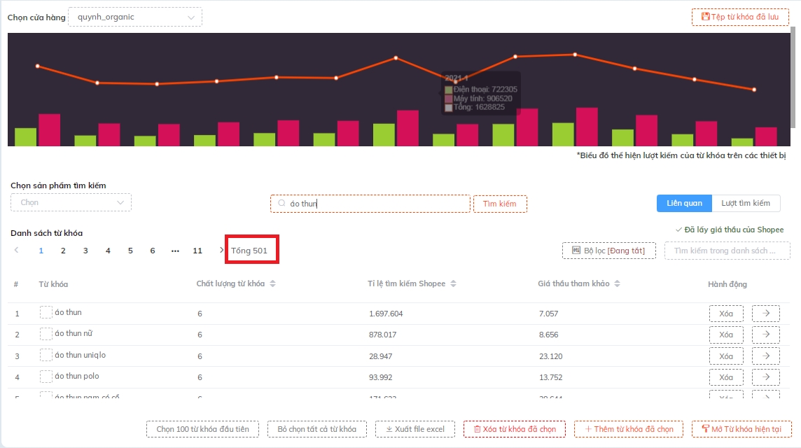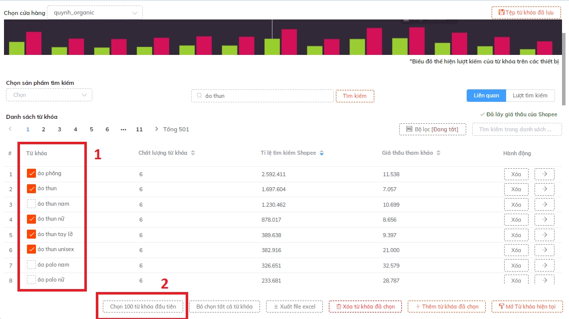 Công cụ nghiên cứu từ khóa Atosa còn có tính năng chọn từ khóa và thêm từ khóa đã chọn để lưu vào hệ thống. Sau đó sử dụng bộ từ khóa này để chạy Quảng cáo thay vì phải nhập thủ công từng từ khóa vào Shopee như trước đây.
