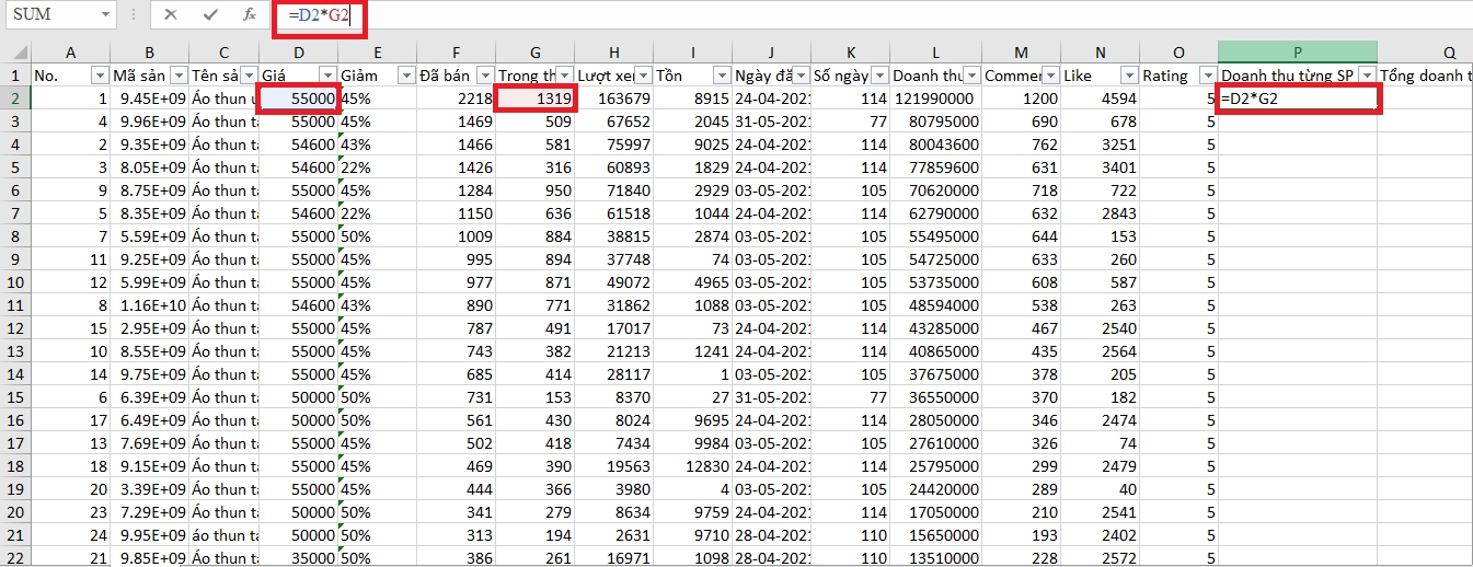 Bước 3: Mở file Excel và thao tác để tính doanh thu cho từng sản phẩm theo hàm: