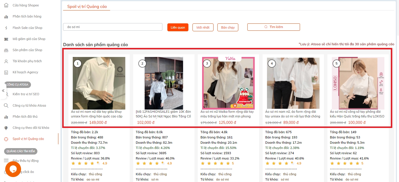 Hệ thống sẽ liệt kê ra tối đa 30 sản phẩm đang chạy quảng cáo từ khóa mà bạn chọn với đầy đủ thông tin chi tiết: Tổng số đã bán, bán trong tháng, doanh thu, tỷ lệ chuyển đổi, kiểu chạy, từ khóa, loại từ khóa,.....