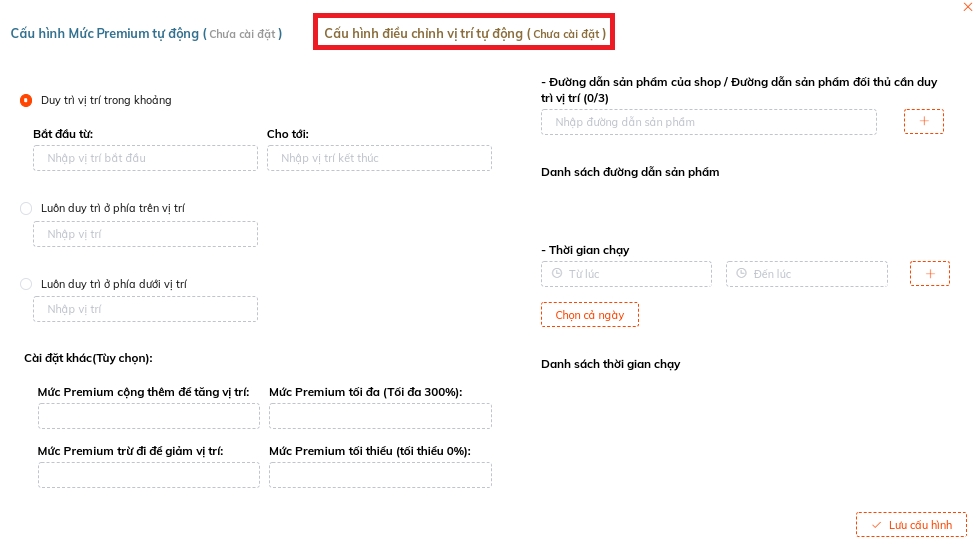 ✔ Duy trì vị trí trong khoảng. Điền khoảng vị trí bạn mong muốn Quảng cáo của mình xuất hiện. Ví dụ: vị trí bắt đầu từ 2 - 5 ✔ Luôn duy trì ở phía trên vị trí. Ví dụ: Trên vị trí 5 ✔ Luôn duy trì ở phía dưới vị trí. Ví dụ: Dưới vị trí 3 ✔ Nhập đường dẫn của shop hoặc đường dẫn của đối thủ (để bám đuổi theo vị trí của đối thủ đó) ✔ Cài đặt "Thời gian chạy" hoặc "Chạy cả ngày"