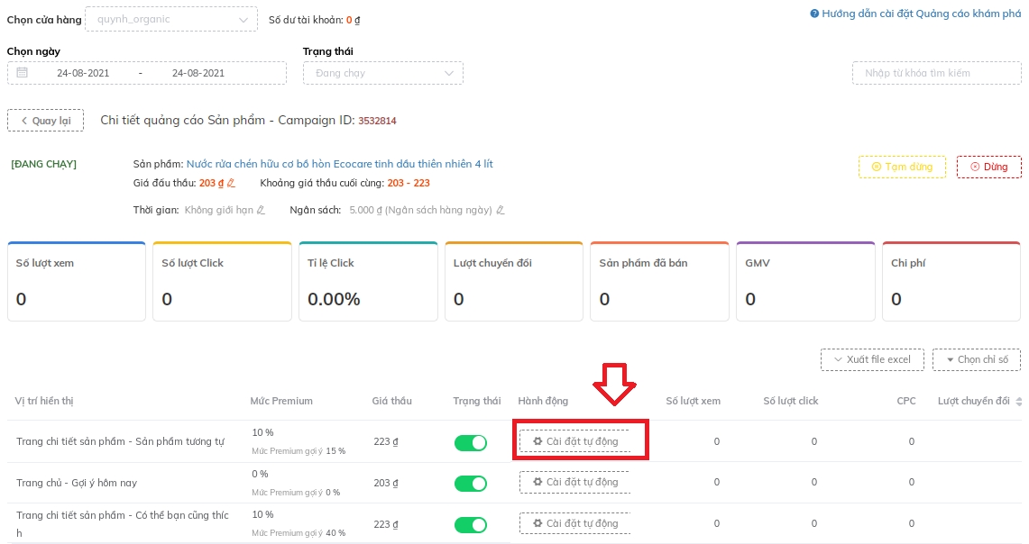 Click vào "Cài đặt tự động" của chiến dịch.