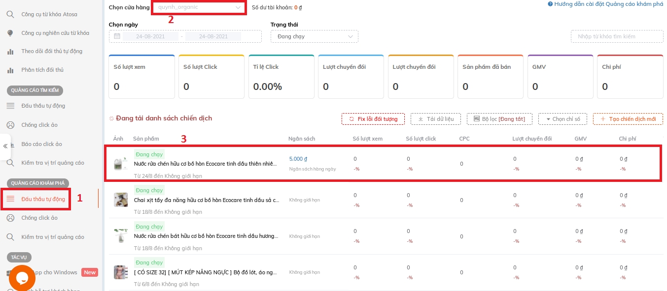 Để cài đặt vị trí tự động cho sản phẩm trong Quảng cáo khám phá, Sốp vào Danh sách chiến dịch chạy quảng cáo và chọn chiến dịch cần cài đặt.