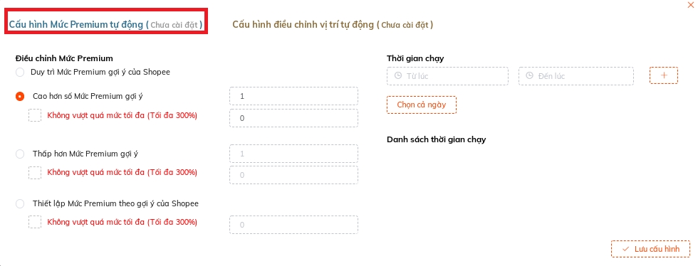 ✔ Duy trì Mức Premium gợi ý của Shopee ✔ Cao hơn mức Premium gợi ý (của Shopee) và cài đặt giới hạn "Không vượt quá mức tối đa (tối đa 300%) ✔ Thấp hơn mức Premium gợi ý (của Shopee) và cài đặt giới hạn "Không vượt quá mức tối đa (Tối đa 300%) ✔ Thiết lập mức Premium theo gợi ý của Shopee và cài đặt giới hạn "Không vượt quá mức tối đa (Tối đa 300%) Cài đặt "Thời gian chạy" hoặc "Chạy cả ngày"