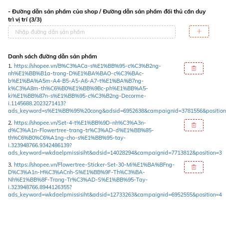 🔖Điều kiện cần: Tìm kiếm từ khóa bất kỳ và sản phẩm của sốp phải có hiển thị trong phần Qc sản phẩm tương tự/gợi ý - có thể bạn cũng thích của các sản phẩm của đối thủ. Copy lấy 3 link sản phẩm đối thủ muốn theo và add vào cài đặt .