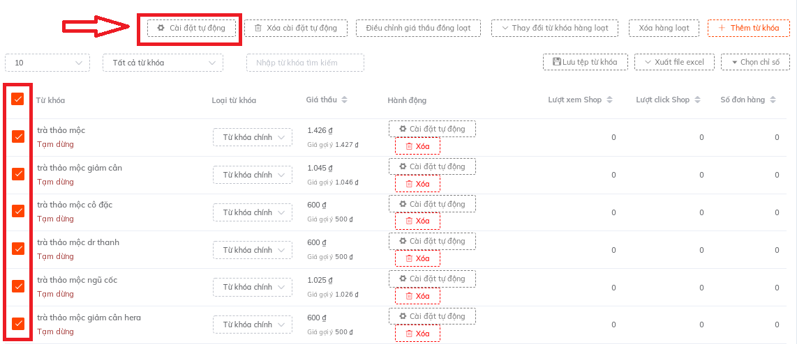 Lựa chọn hết tất cả các từ khóa và ấn " Cài đặt tự động"