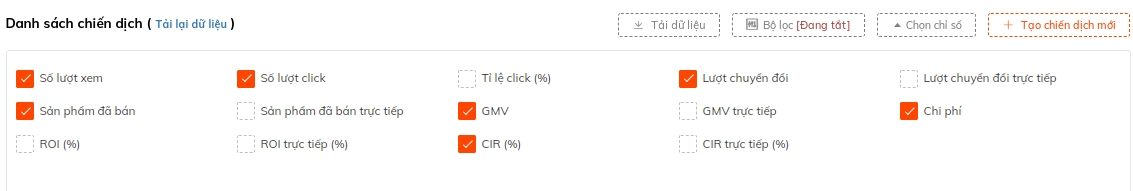Sốp có thể chọn nhiều loại chỉ số khác nhau như CIR, số view, số click, số đơn hàng... để xem cùng 1 lúc. Vô cùng tiện lợi!
