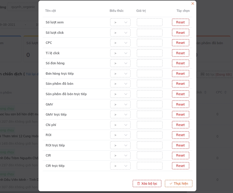 Và nếu cần thì sốp có thể tìm kiếm chiến dịch bằng cách sử dụng nút search phía bên tay phải: