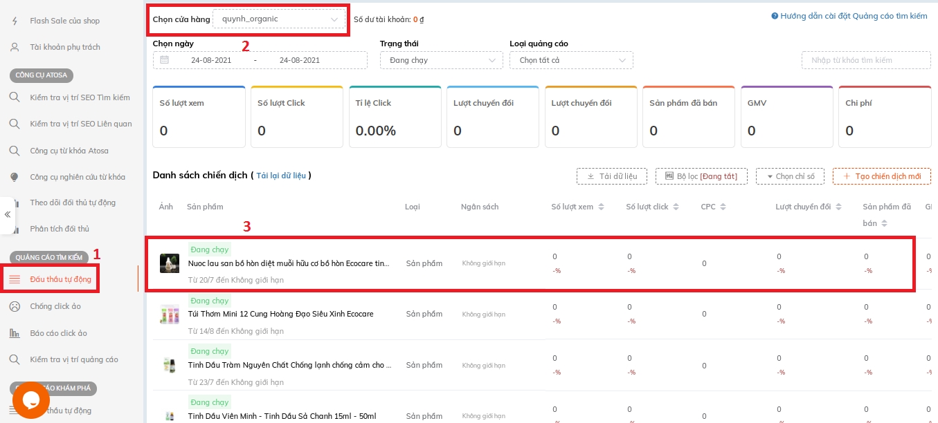 Sốp xem các quảng cáo đang chạy bằng cách truy cập vào link dưới đây nha: https://app.atosa.asia/marketing Và chọn Shop, chọn tình trạng Quảng cáo là "Đang chạy" để tối ưu