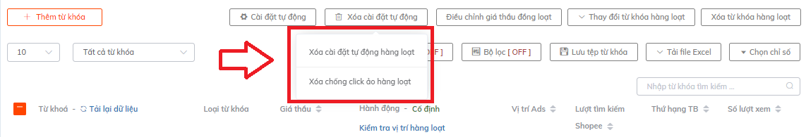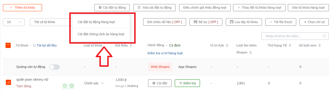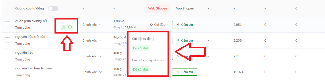 Hoặc trực tiếp ấn " cài đặt tự động" cho 1 từ khóa sốp muốn cài click tặc luôn