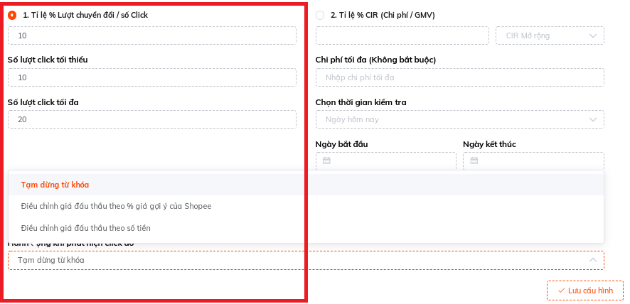 ☑ Số lượt click tối thiểu: Nếu số lượt click và số lượt bán còn đang nhỏ, bạn cần đặt số lượt click tối thiểu bằng với số lượt click tối thiểu để ra đơn (theo dõi trong thực tế). Ví dụ: mặt hàng áo thun của bạn trung bình cần 20 click mới ra 1 đơn thì số lượt click tối thiểu ở đây là 20.