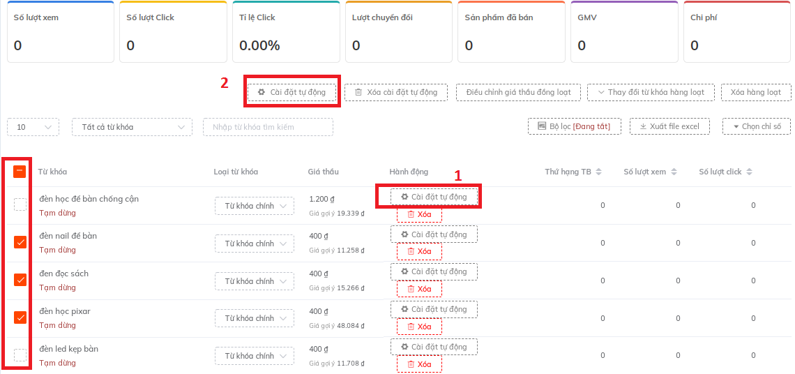 Sốp lựa chọn các từ khóa muốn cài chống click tặc và ấn nút "cài đặt tự động".