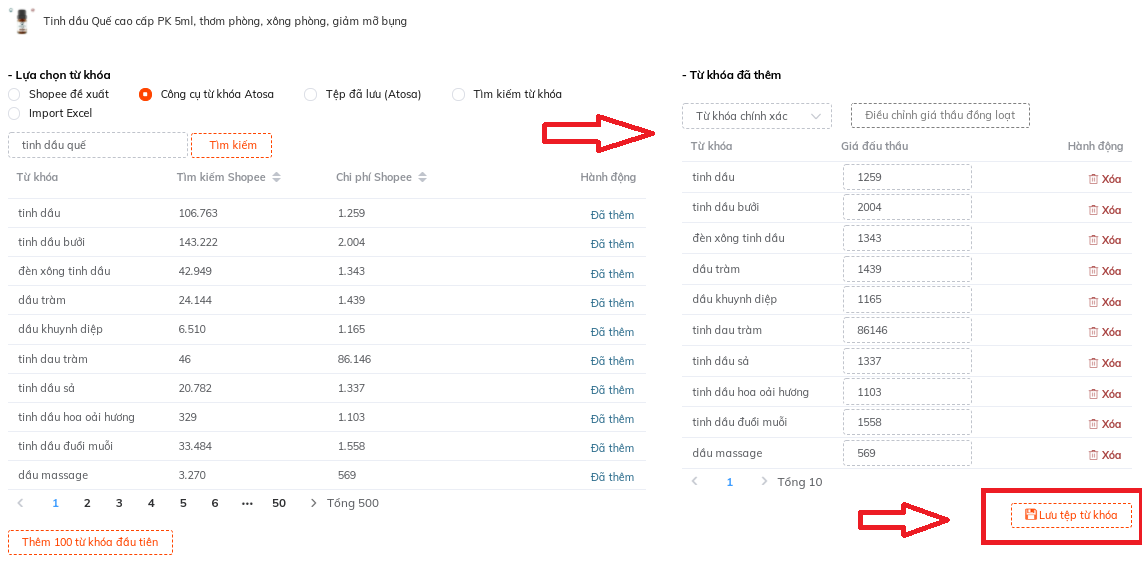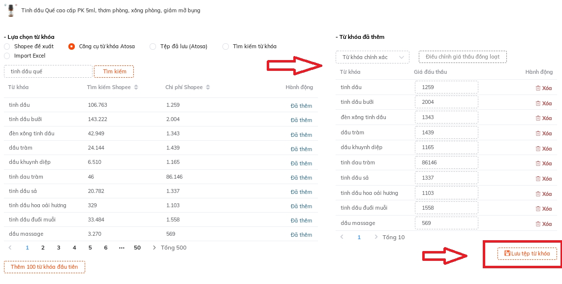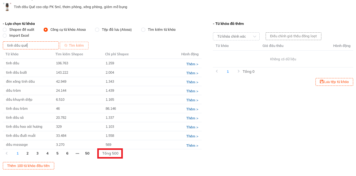 Sốp chỉ cần đưa vào 1 từ thì hệ thống Atosa sẽ đưa ra 500 từ khóa để Sốp chọn lựa.