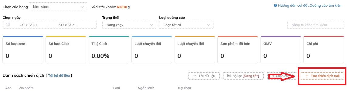 Sau đó hãy xem bên tay phải và ấn nút tạo " + chiến dịch mới" như hình này nè