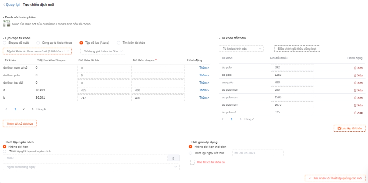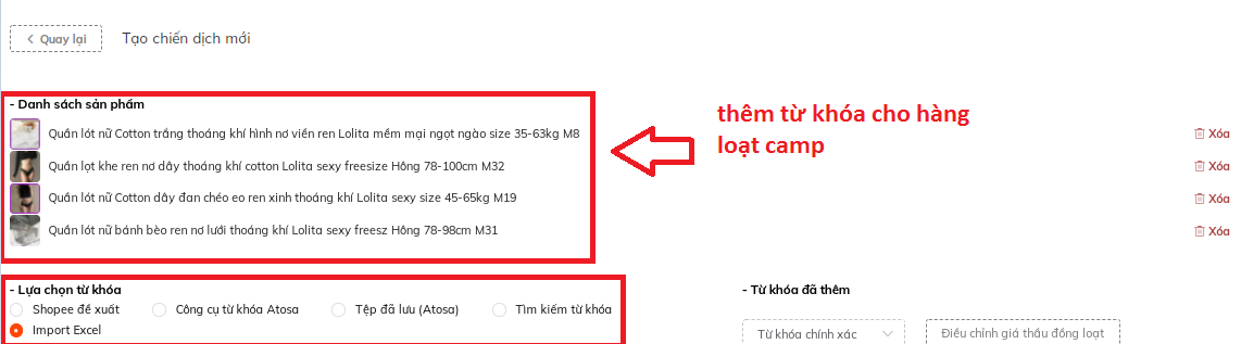 Nếu sốp Chạy camp hàng loạt có thể thêm được từ khóa cho hàng loạt camp chỉ với cùng 1 click ( Ở Shopee thì không thể đâu nha). Shop nào chạy sản phẩm cùng từ khóa dạng bán áo thun thì tiện vô cùng luôn...