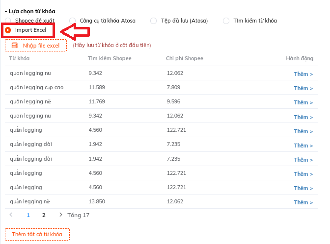 Import Excel: là file dữ liệu từ khóa dạng excel shop đã lưu