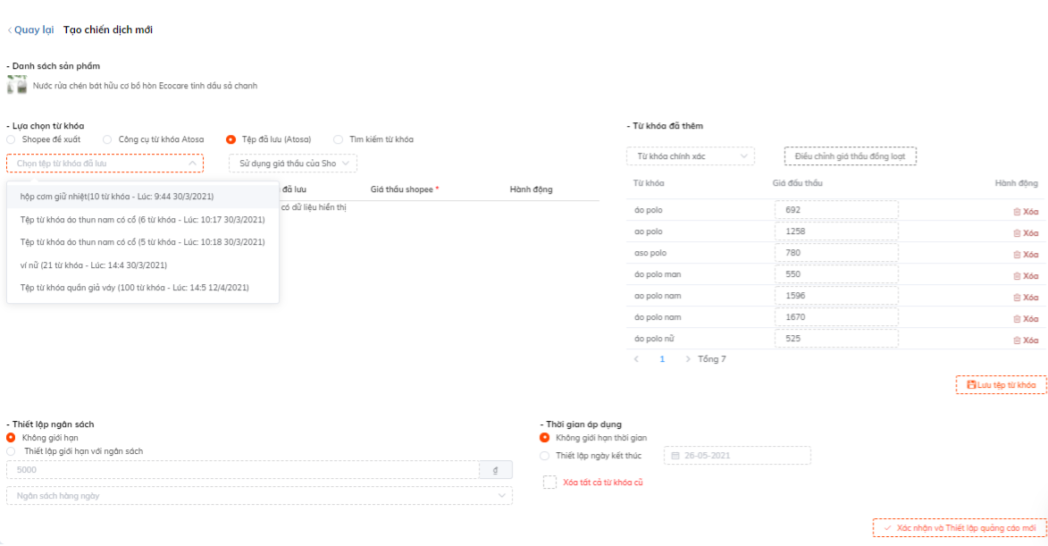Thêm vào tệp từ khóa : sốp thêm các từ khóa vào chiến dịch rồi ấn " Lưu tệp từ khóa" và đặt tên cho tệp. (Tốt nhất nên chọn phần này trước để sau này chạy sản phẩm khác hoặc Shop khác cho thuận tiện)
