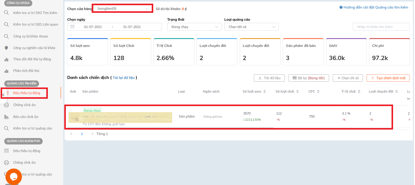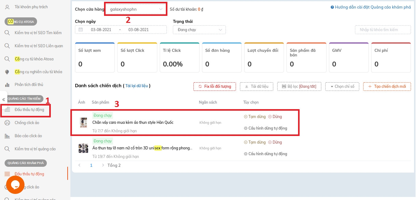 Sốp vào App.atosa.asia, chọn “Đấu thầu tự động” -> chọn “thêm cửa hàng” -> chọn chiến dịch muốn xóa từ khóa.