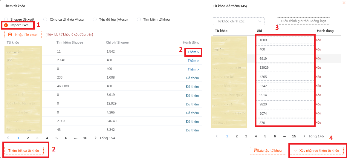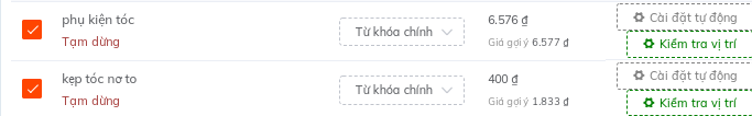 Sốp hãy thêm bộ từ khóa đã lưu hôm trước. Từ khóa nào đang chạy rồi sẽ không thể thêm ( xuất hiện nút " đã thêm"); từ khóa nào hiện tại chưa chạy có nút " thêm".