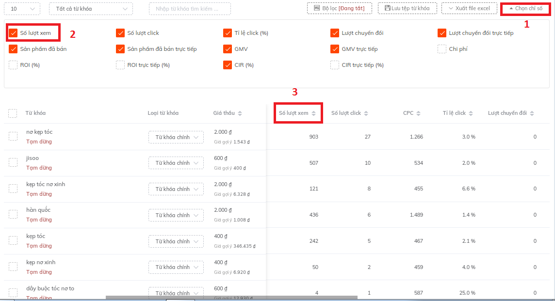 2. Lọc theo cột lượt xem: có sắp xếp từ cao xuống thấp - từ khóa nào không có lượt xem thì hãy xóa đi