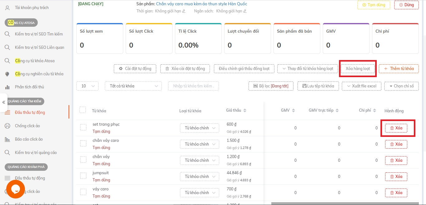 Sốp có thể lựa chọn xóa 1 hoặc xóa nhiều từ khóa cùng lúc chỉ trong vài giây. Atosa sẽ xóa các từ khóa này vĩnh viễn. Sau đó sốp có thể tha hồ thêm các từ khóa phù hợp mà mình mong muốn vào chiến dịch.